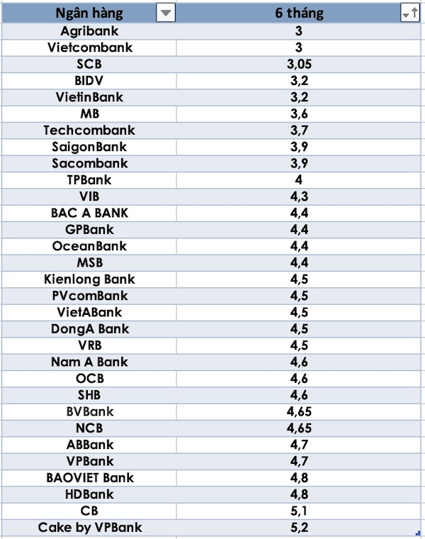 Ở kỳ hạn 6 tháng, ngân hàng có lãi suất cao nhất là Cake by VPBank với 5,2%. Ngân hàng có lãi suất thấp nhất kỳ hạn này là Agribank với 3% và Vietcombank cũng 3%.