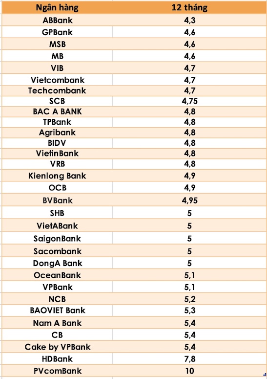 Ngân hàng có lãi suất thấp nhất ở kỳ hạn này là ABBank với 4,3%.