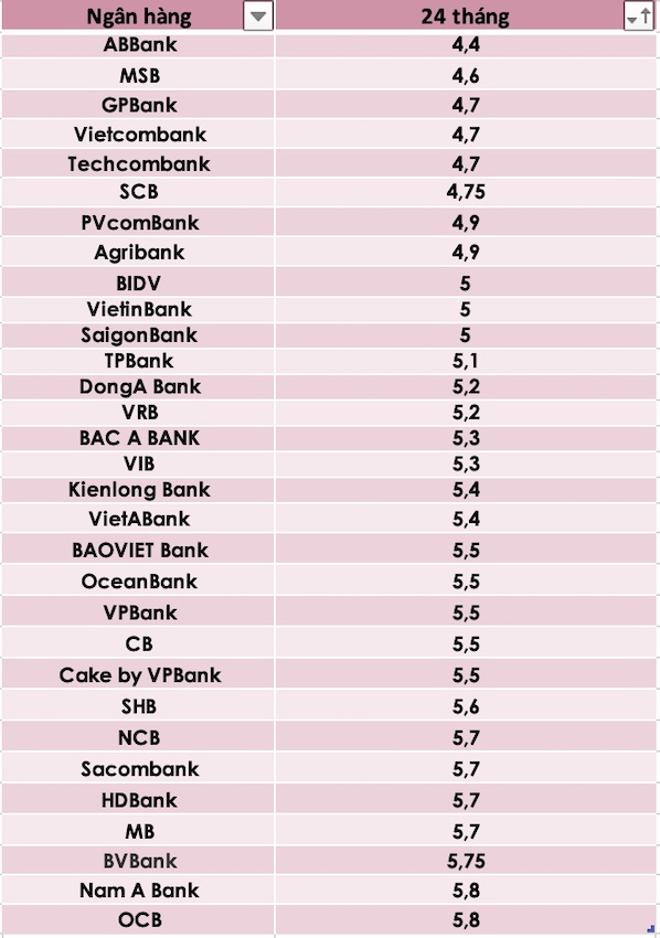 Với kỳ hạn 24 tháng, ngân hàng có lãi suất huy động cao nhất là Nam A Bank và OCB với mức 5,8%. Ngân hàng có lãi suất thấp nhất ở kỳ hạn này là ABBank với 4,4% và MSB cũng 4,6%.