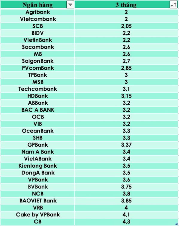 Ngân hàng có mức lãi suất thấp nhất kỳ hạn 3 tháng là Agribank với 2%. Một số ngân hàng khác cũng có mức lãi suất thấp ở mức 2% gồm Vietcombank, SCB.