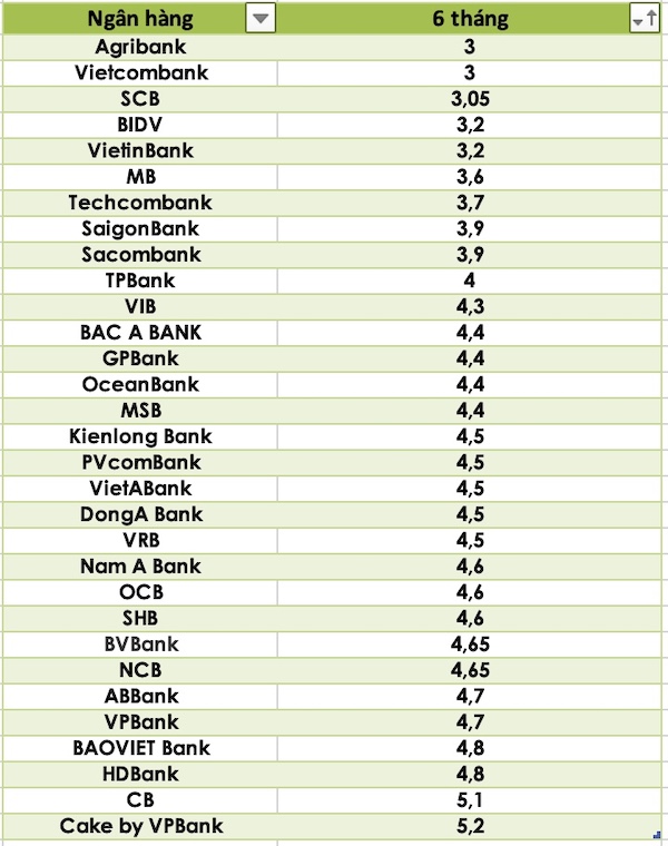 Ở kỳ hạn 6 tháng, ngân hàng có lãi suất cao nhất là Cake by VPBank với 5,2%, tiếp đến là CB 5,1% và HDBank 4,8%. Ngân hàng có lãi suất thấp nhất kỳ hạn này là Agribank và Vietcombank là 3%.