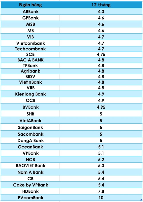 Ngân hàng có lãi suất thấp nhất ở kỳ hạn này là ABBank với 4,3%, GPBank 4,6%, MSB 4,6%.
