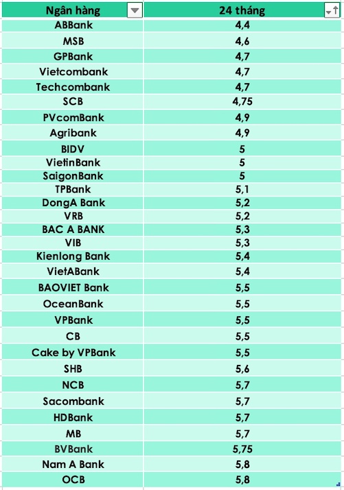 Với kỳ hạn 24 tháng, ngân hàng có lãi suất huy động cao nhất là Nam A Bank và OCB với mức 5,8%. Ngân hàng có lãi suất thấp nhất ở kỳ hạn này là ABBank với 4,4% và MSB cũng 4,6%.