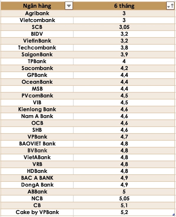 Ở kỳ hạn 6 tháng, lãi suất cao nhất là 5,2%/năm của Cake by VPBank. Lãi suất thấp nhất là 3%/năm của Agribank và Vietcombank. Như vậy, chênh lệch lãi suất cao và thấp nhất kỳ hạn 6 tháng là 2,2%/năm.