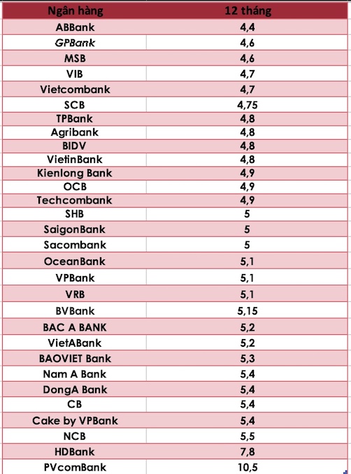 Kỳ hạn 12 tháng, lãi suất cao nhất là 10%/năm của PVcomBank. Lãi suất thấp nhất là 4,4%/năm của ABBank . Chênh lệch lãi suất cao và thấp nhất ở kỳ hạn này là 5,6%/năm.