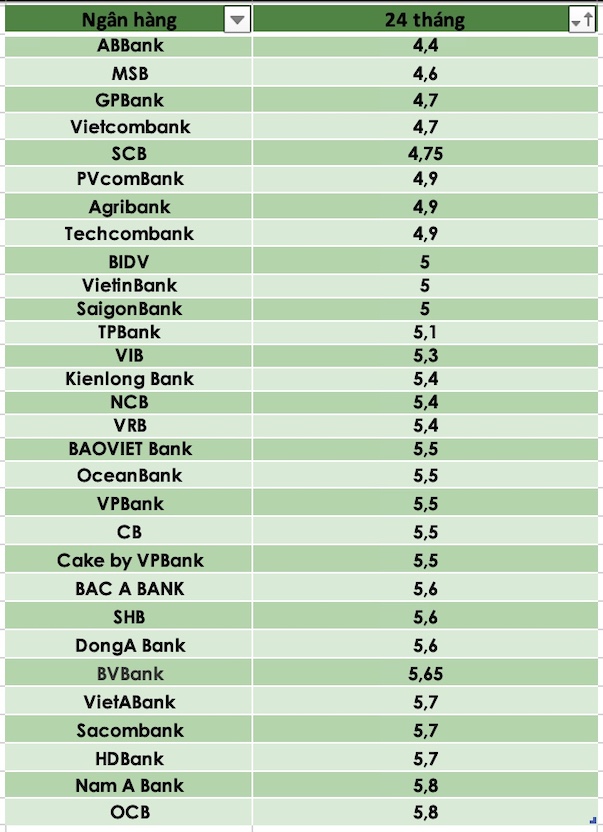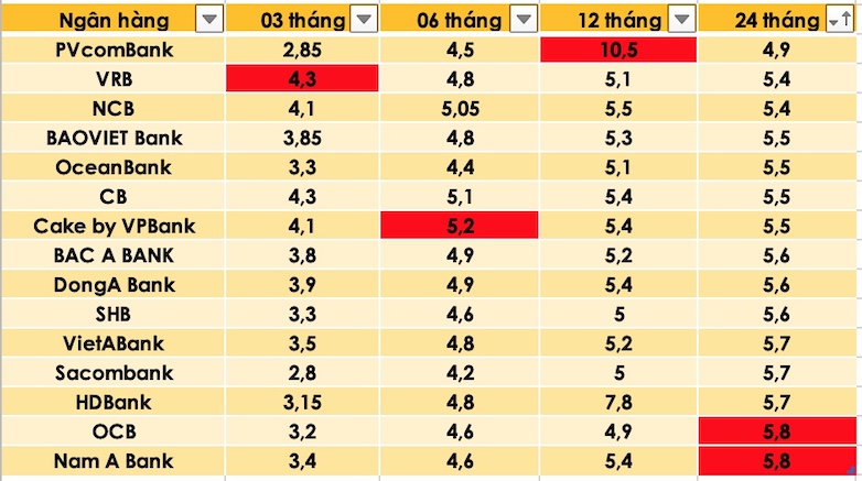Cuối cùng, với kỳ hạn 24 tháng, OCB dẫn đầu với lãi suất 5,8%/năm. Lãi suất thấp nhất là 4,4%/năm của ABBank. Chênh lệch lãi suất cao nhất và thấp nhất ở kỳ hạn 24 tháng là 1,4%/năm.