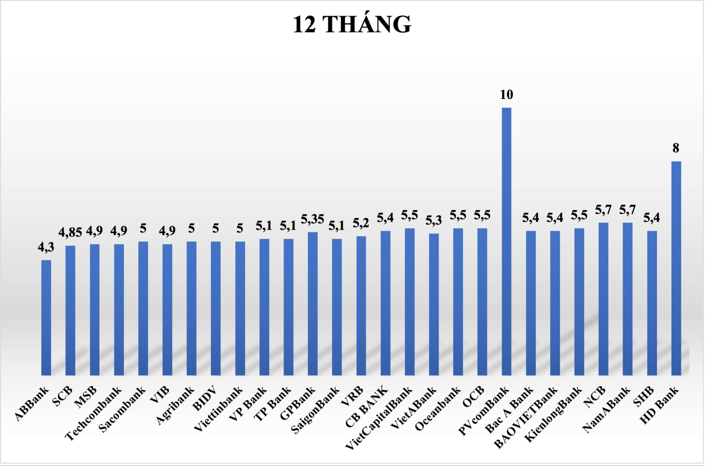 Tại kỳ hạn 12 tháng lãi suất tiết kiệm các ngân hàng trong hệ thống giao động từ 4,3%-10%/năm.