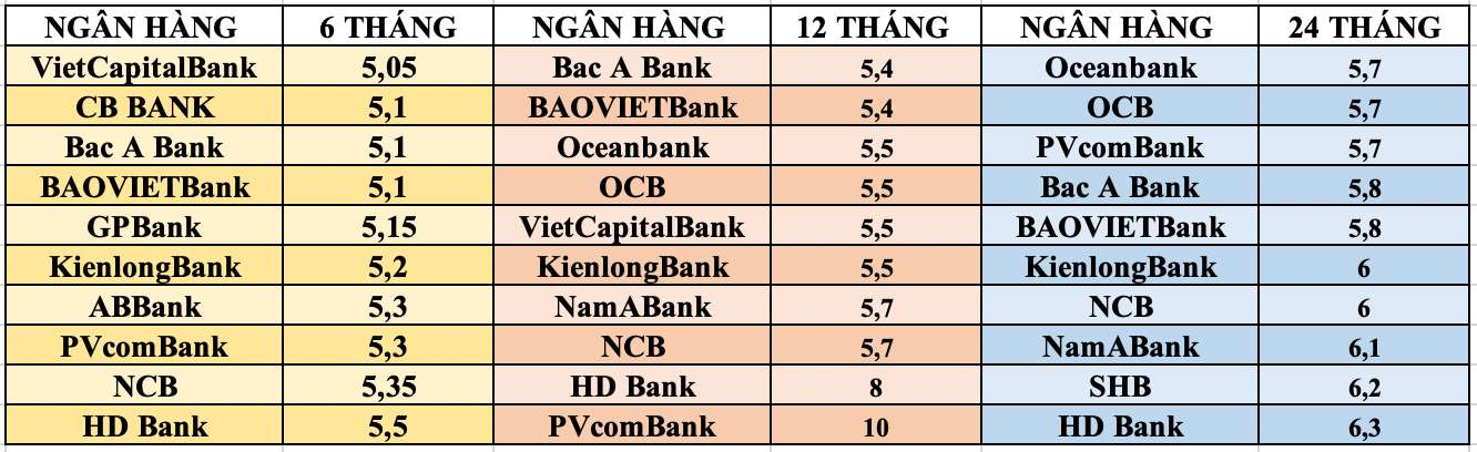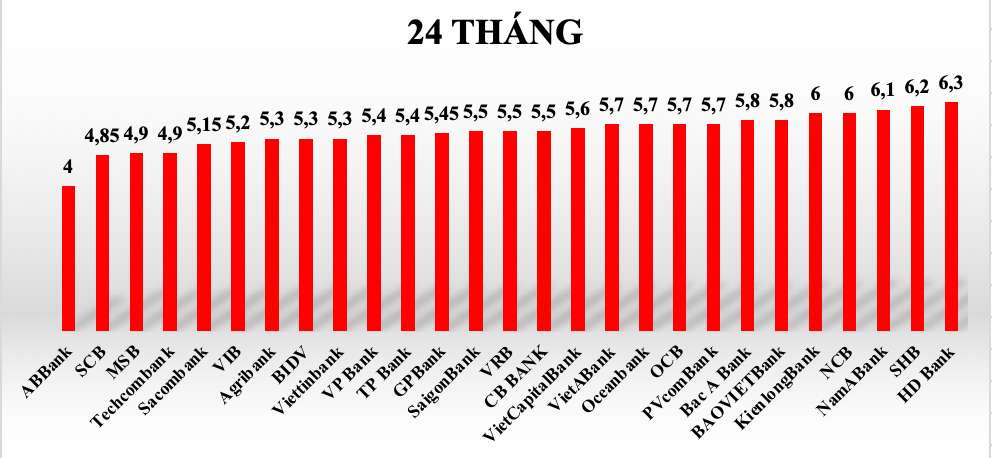 Tại kỳ hạn 24 tháng lãi suất tiết kiệm các ngân hàng trong hệ thống giao động từ 4%-6,3%/năm.