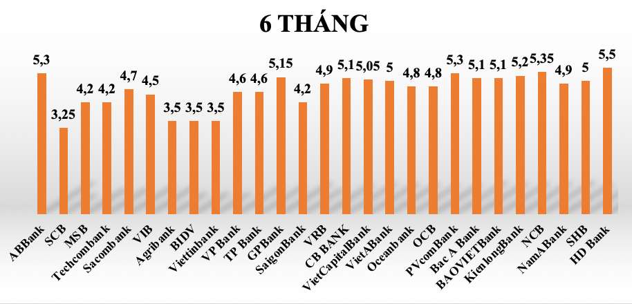 Tại kỳ hạn 6 tháng lãi suất tiết kiệm các ngân hàng trong hệ thống giao động từ 3,25%-5,5%/năm.