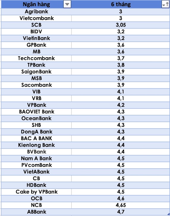 So sánh lãi suất ngân hàng cao nhất ở kỳ hạn 3 tháng. Đồ hoạ Trà MyLãi suất gửi tiết kiệm tại các ngân hàng kỳ hạn 6 tháng: