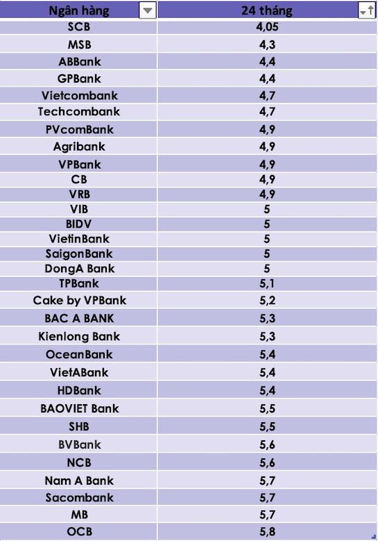 Tại Ngân hàng Sài Gòn Thương Tín (SCB), lãi suất kỳ hạn 3 tháng, 6 tháng, 12 tháng và 24 tháng đã giảm lần lượt từ 2,05%, 3,05%, 4,75% và 4,75% xuống mức 2,05%, 3,05%, 4,05% và 4,05%. Đây là mức giảm đáng kể, đặc biệt là với kỳ hạn 12 tháng và 24 tháng, giảm 0,7%.