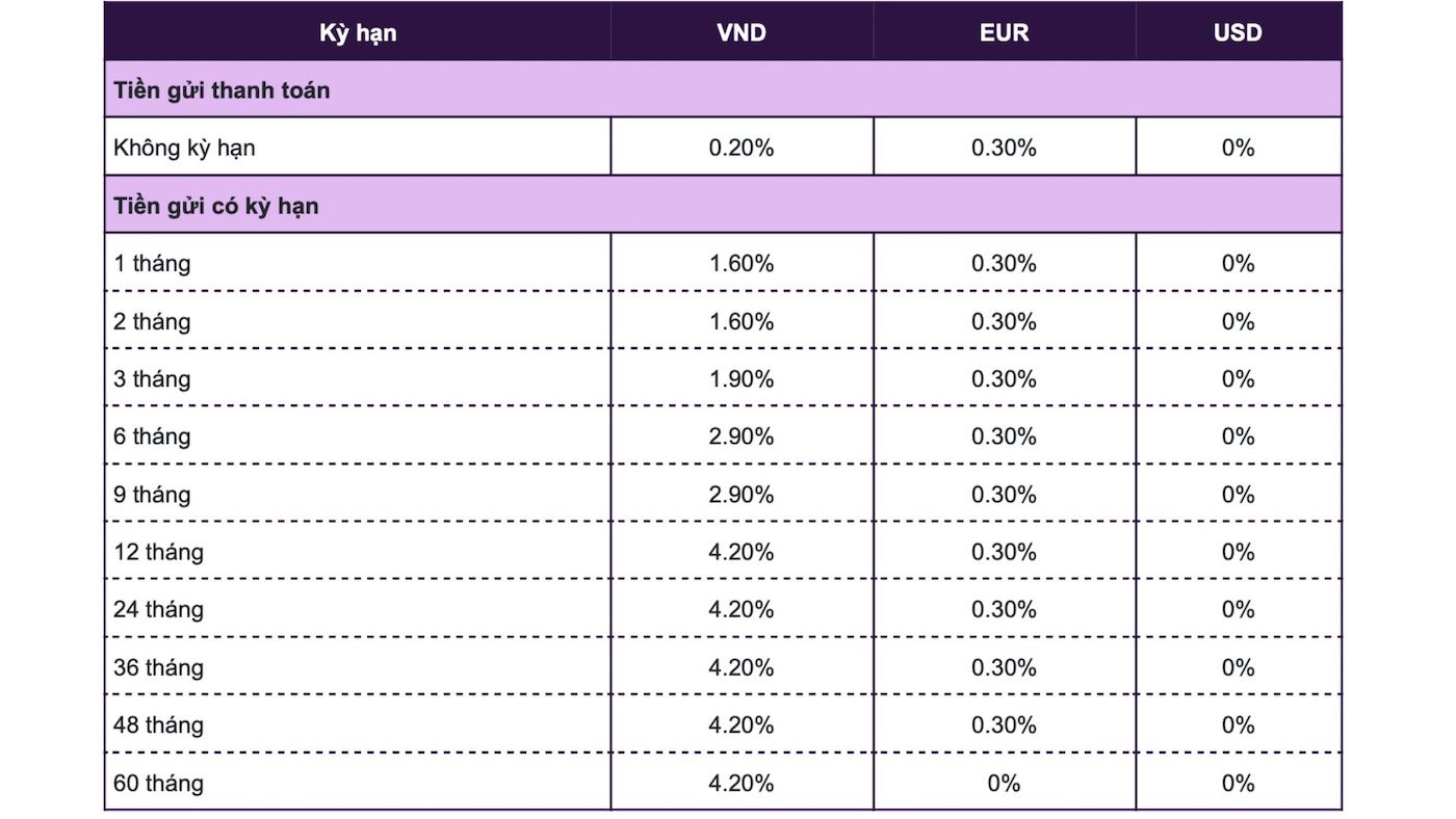 Mức lãi suất cao nhất 4,2%/năm được áp dụng cho các kỳ hạn từ 12 - 60 tháng, giảm 0,1%/năm. Các khoản tiền gửi không kỳ hạn sẽ được niêm yết lãi suất thấp ở mức 0,2%/năm.