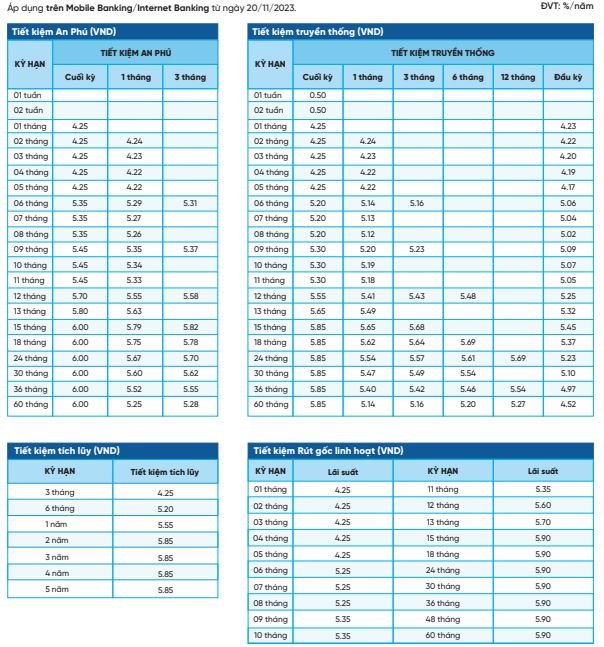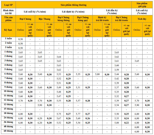* Thông tin về lãi suất chỉ mang tính chất tham khảo và có thể thay đổi trong từng thời kì. Vui lòng liên hệ điểm giao dịch ngân hàng gần nhất hoặc hotline để được tư vấn cụ thể.