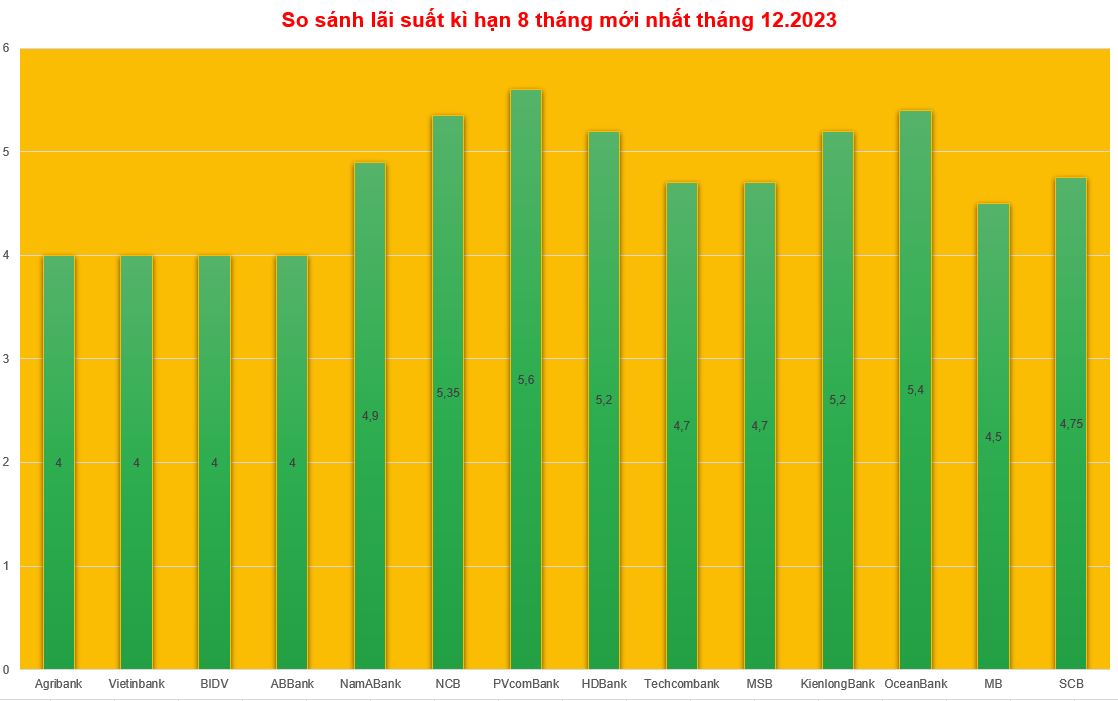 Dưới đây là chi tiết biểu lãi suất nhóm ngân hàng dẫn đầu kì hạn 8 tháng, bạn đọc có thể tham khảo.