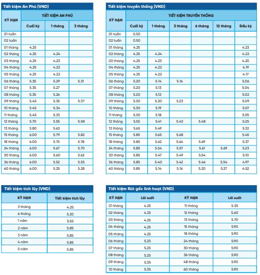 Các kỳ hạn gửi tiết kiệm dưới 6 tháng, lãi suất áp dụng ở mức 4,25%.