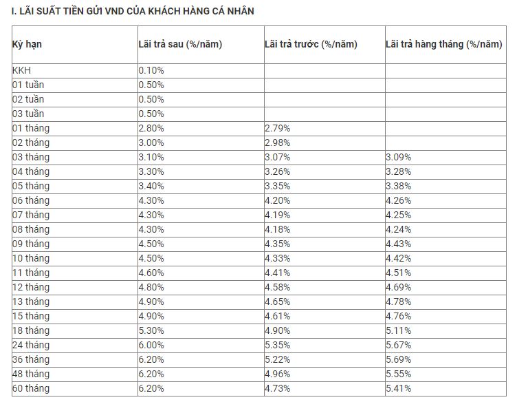 Trong đó, lãi suất MB cao nhất là 6,2%, đối với kỳ hạn gửi tiết kiệm 36 tháng, 48 tháng, và 60 tháng. Kế tiếp là kỳ hạn 24 tháng, lãi suất gửi tiết kiệm MB là 6,0%.