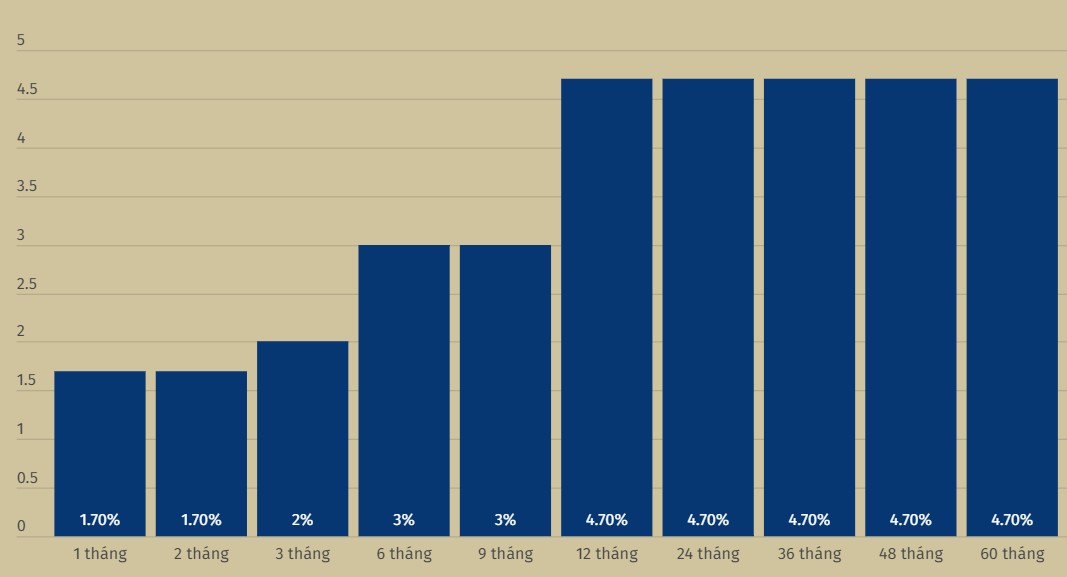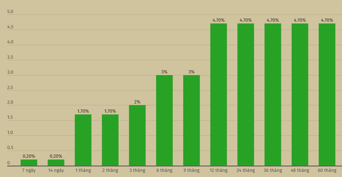 Theo đó, ngân hàng này niêm yết lãi suất 1-2 tháng ở ngưỡng 1,7%/năm; 3 tháng ở ngưỡng 2%/năm; 6-9 tháng ở ngưỡng 3%/năm; 12-60 tháng ở ngưỡng 4,7%/năm.