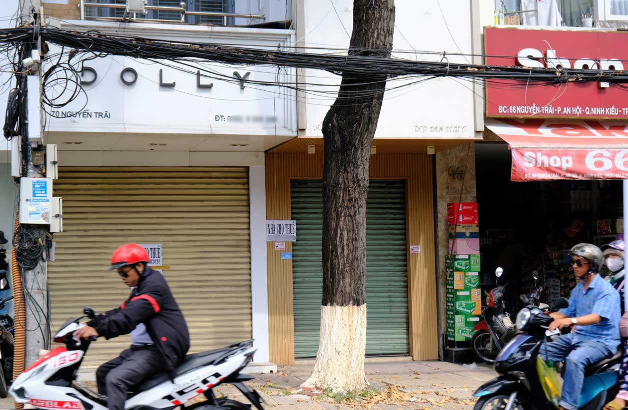 Nhiều mặt bằng tại tuyến phố thời trang Nguyễn Trãi (quận Ninh Kiều, TP Cần Thơ) vắng bóng người thuê. Ảnh: Mỹ LyCùng chồng làm nghề sửa xe trên đường Nguyễn Trãi đã gần 10 năm, bà Liên (60 tuổi) cho biết, tuyến đường này trước đây vốn rất sầm uất, cửa hàng quần áo mở san sát nhau, nhưng vài năm trở lại đây thì việc buôn bán không còn được như ngày xưa.