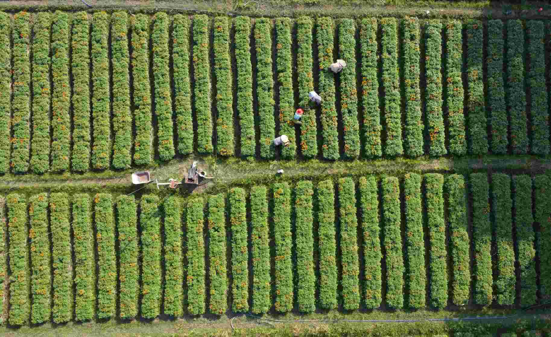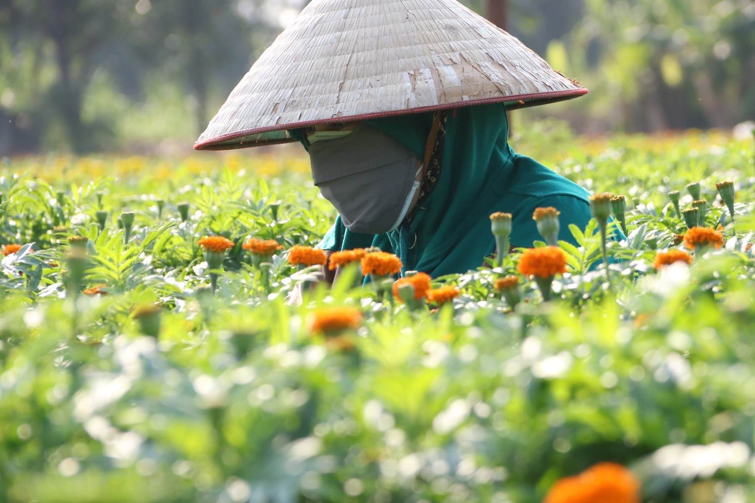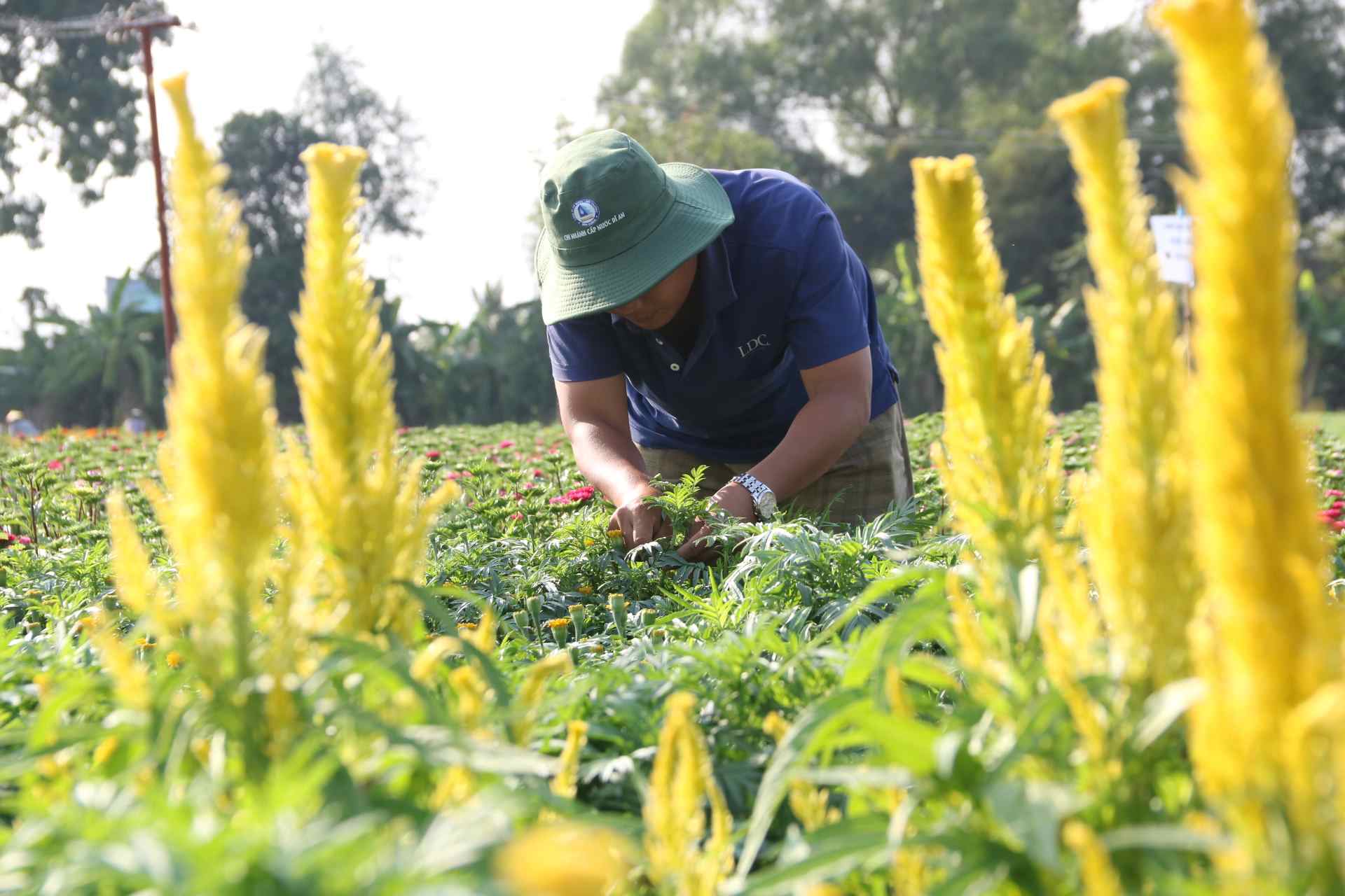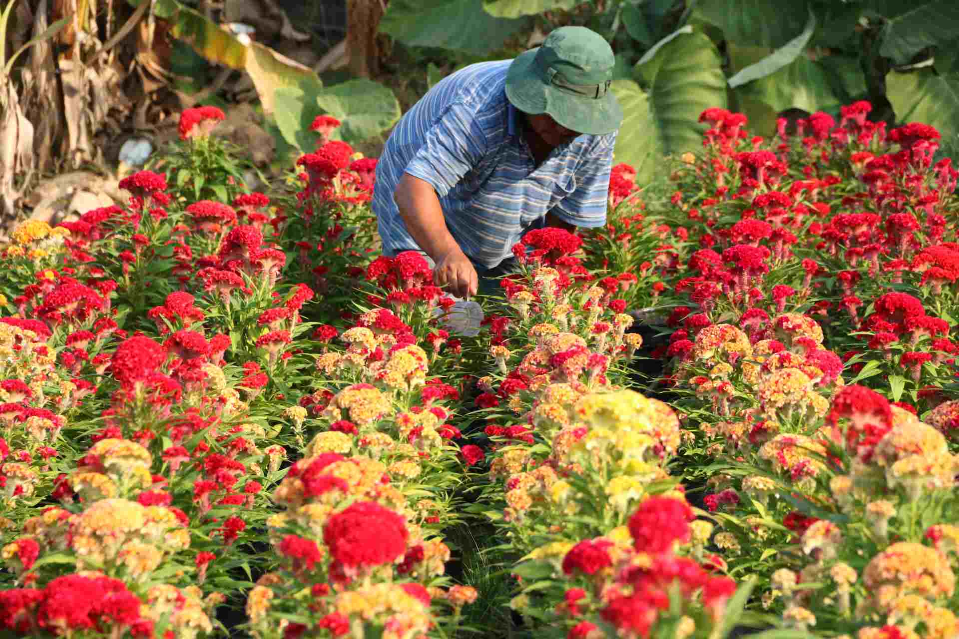Anh Nguyễn Phước Hải (35, tuổi, phường Thái Hòa, thành phố Tân Uyên) chia sẻ: "Ở làng hoa Tân Ba, Tết là vụ hoa chính. Người dân trồng chủ yếu là hoa vạn thọ, cúc, hướng dương. Gia đình tôi nhận khoảng hơn 1.000 m2 trồng khoảng 6.000 cây hoa ngũ sắc, vạn thọ".