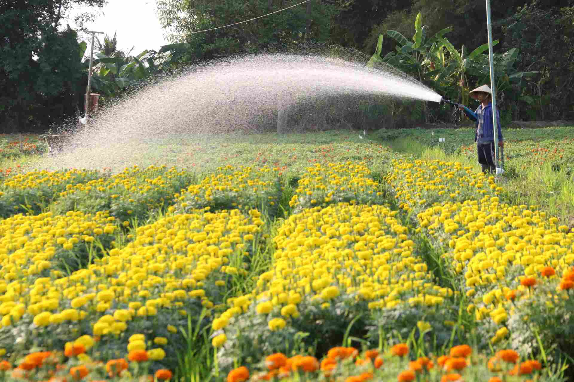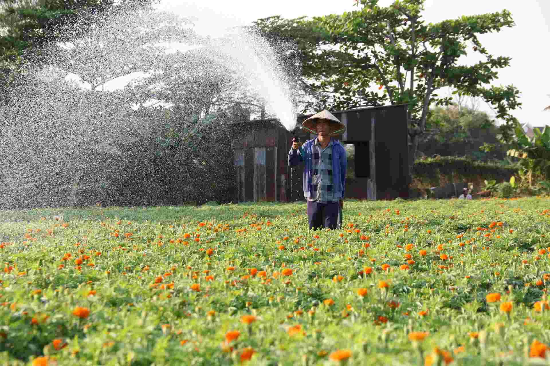 "Tôi đang tưới đẫm nước để những luống hoa nở kịp bung nở vào trước 23 Tết. Tôi trồng 30.000 cây, nhưng với số lượng này cũng không đủ cung cấp cho thị trường Bình Dương và Đồng Nai“ - ông Dũng chia sẻ.