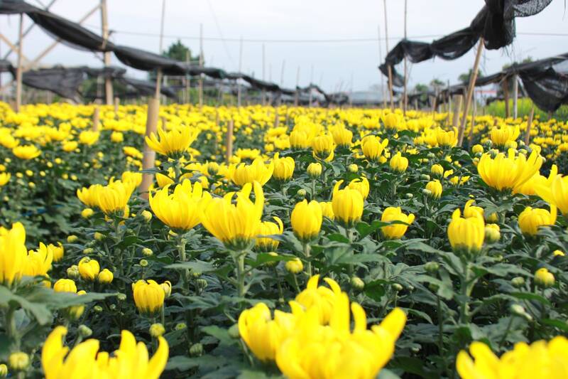 Những luống hoa cúc vàng bắt đầu bung nở. Ảnh: Lê TâmÔng Nguyễn Ánh (chủ một vườn tại làng Tây Tựu, quận Bắc Từ Liêm) chia sẻ, hoa đẹp phụ thuộc rất lớn vào thời tiết. Theo ông Ánh, thời tiết năm nay không thuận lợi, ấm hơn mọi năm, có những hôm trời mưa to làm bong hết lớp giấy báo bọc ngoài, làm những vườn hoa hồng ở đây mất dáng và dễ dập nát.