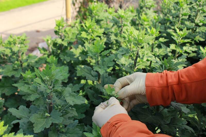Nhiều chủ vườn tại làng hoa Tây Tựu đang phải đi tỉa bớt những nụ không đạt yêu cầu trên các cây. Ảnh: Lê TâmCác chủ vườn tại làng hoa Tây Tựu hiện tại đang phải đi tỉa bớt những nụ không đạt yêu cầu trên các cây, chỉ để lại nụ lớn để cây phát triển, hoa chính nở đẹp và to hơn.