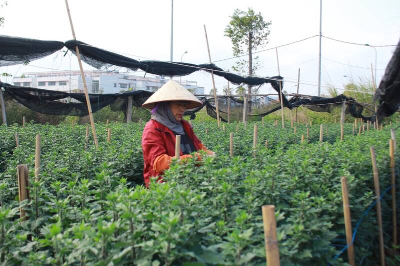 Bà Chu Thị Hương đang chăm sóc những luống hoa. Ảnh: Lê TâmBên cạnh hoa cúc, theo bà Hương, nhiều giống hoa khác được các chủ vườn tại làng hoa Tây Tựu chăm sóc, phục vụ dịp Tết Nguyên đán như hoa hồng, hoa ly, thược dược…