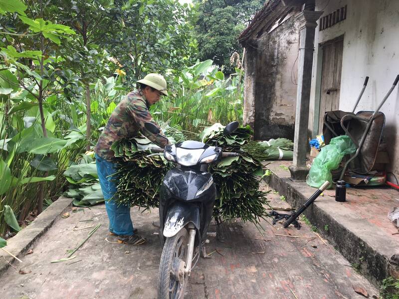 Ông Phong đi cắt lá dong từ 7h sáng. Ảnh: Lê Tâm"Tôi đi cắt, chở lá dong từ 7h sáng, mỗi ngày cắt được khoảng hơn 3 vạn lá. Ngay sau khi thu hoạch, lá dong sẽ được các hộ dân tại đây rửa qua nước sạch, xếp thành bó để chờ thương lái đến lấy hàng.