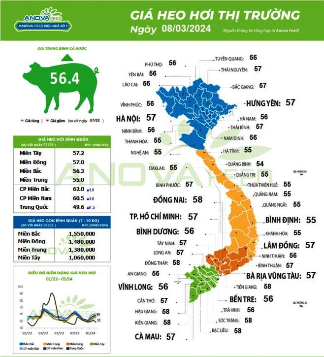 Số liệu của Anova Feed - một doanh nghiệp khá có tiếng trong ngành chăn nuôi và sản xuất thức ăn chăn nuôi nêu cụ thể: Ngày 8.3.2024, tại các tỉnh phía Nam, giá lợn hơi cao nhất tại “thủ phủ” chăn nuôi Đồng Nai, Tiền Giang, Kiên Giang, Hậu Giang, Sóc Trăng, Bạc Liêu, Đồng Tháp, cùng bán ra với giá 58.000 đồng/kg. Các tỉnh còn lại bán lợn hơi với giá 56.000-57.000 đồng/kg. Bình Dương, Bến Tre, Trà Vinh, Vĩnh Long, An Giang là những tỉnh có giá lợn hơi thấp nhất khu vực (56.000 đồng/kg).