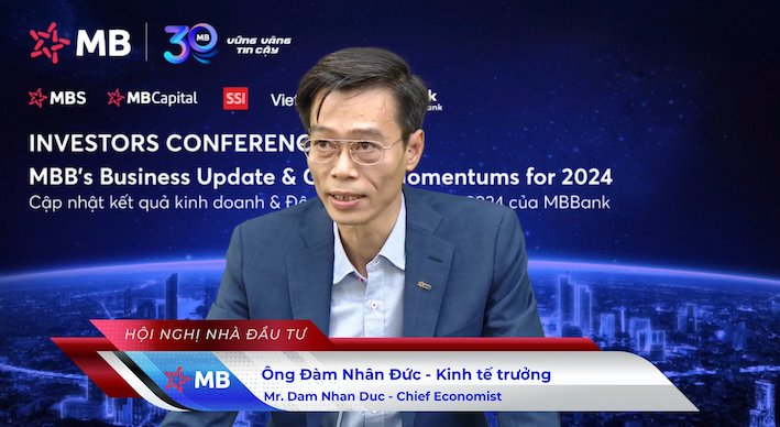 Cũng theo Kinh tế trưởng MB, năm 2023 động lực tăng trưởng của nền kinh tế chỉ có đầu tư công, đầu năm 2024 mảng tiêu dùng vẫn tốt nhưng tăng trưởng yếu, ngoài ra mảng xuất nhập khẩu phục hồi rõ nét trong những tháng đầu năm. Ông Đức dự đoán đây là nhân tố sẽ hỗ trợ cho tăng trưởng ngành ngân hàng tích cực hơn so với 2023.