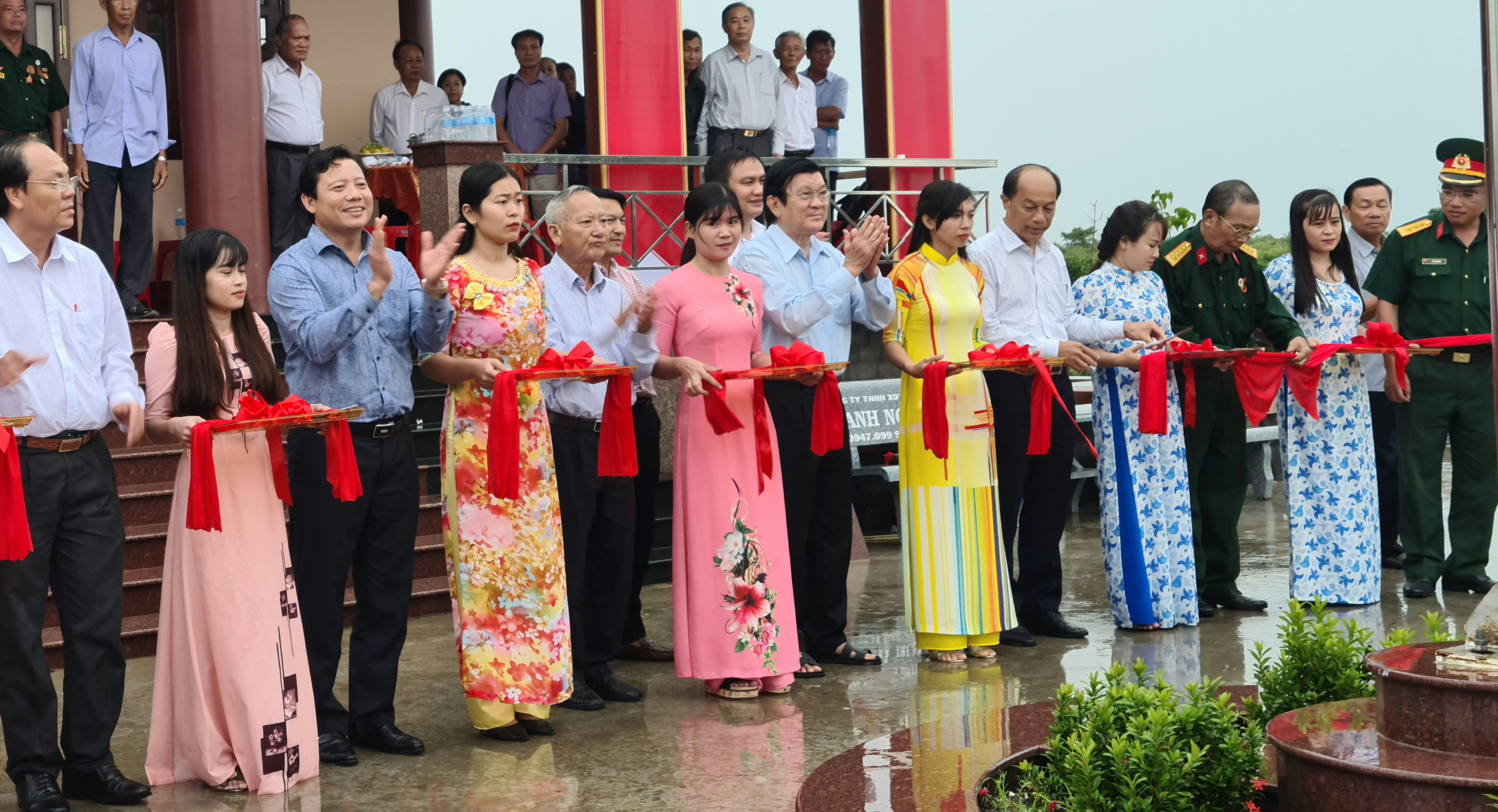 Nguyên Chủ tịch nước Trương Tấn Sang (giữa) tại lễ khánh thành công trình di tích Đồn Long Khốt ở khu vực biên giới tỉnh Long An |