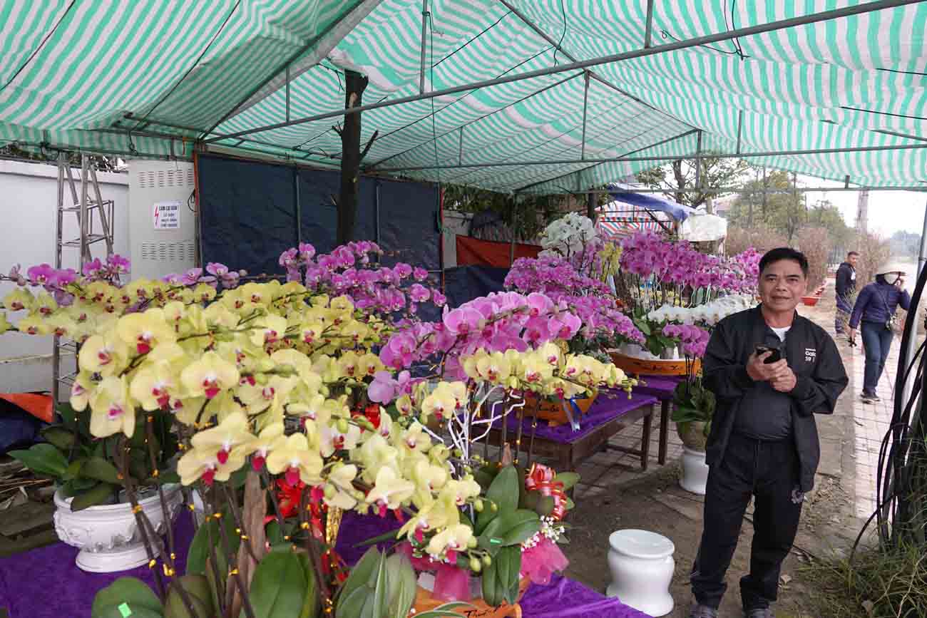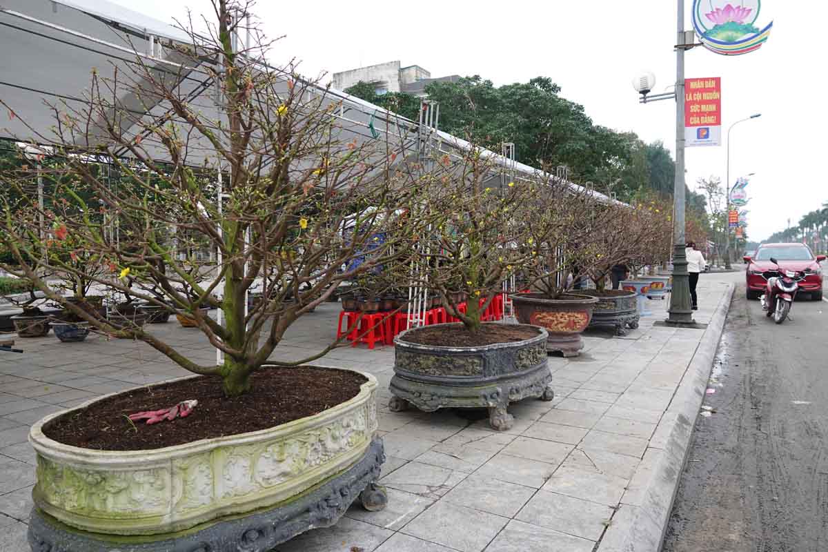 Cạnh gian hàng của anh Đức, anh Trương Quang Dương (43 tuổi, trú thôn Liên Hương, xã Thạch Đài, huyện Thạch Hà, tỉnh Hà Tĩnh) cũng đã bày bán 20 gốc đào loài gốc lớn có giá bình quân từ 7 - 10 triệu đồng/gốc.