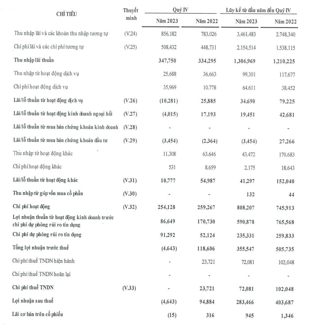 Chỉ tính riêng quý IV/2023, PGBank có lợi nhuận sau thuế âm hơn 4,6 tỉ đồng, giảm 99,5 tỉ đồng, tương đương 105% so với cùng kỳ năm 2022.