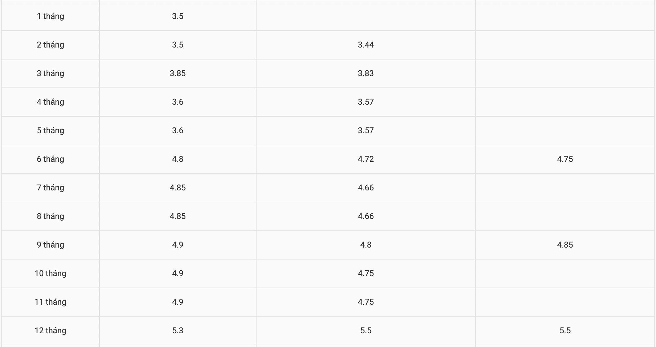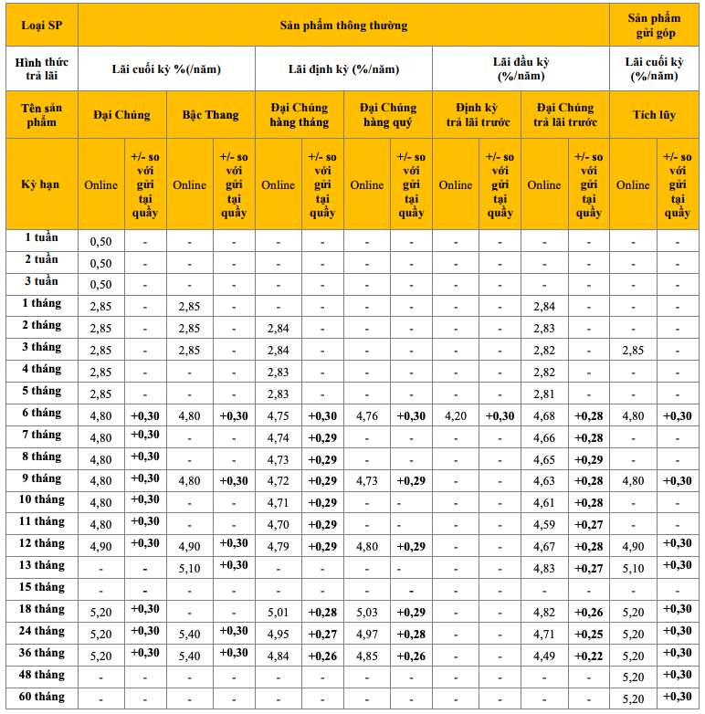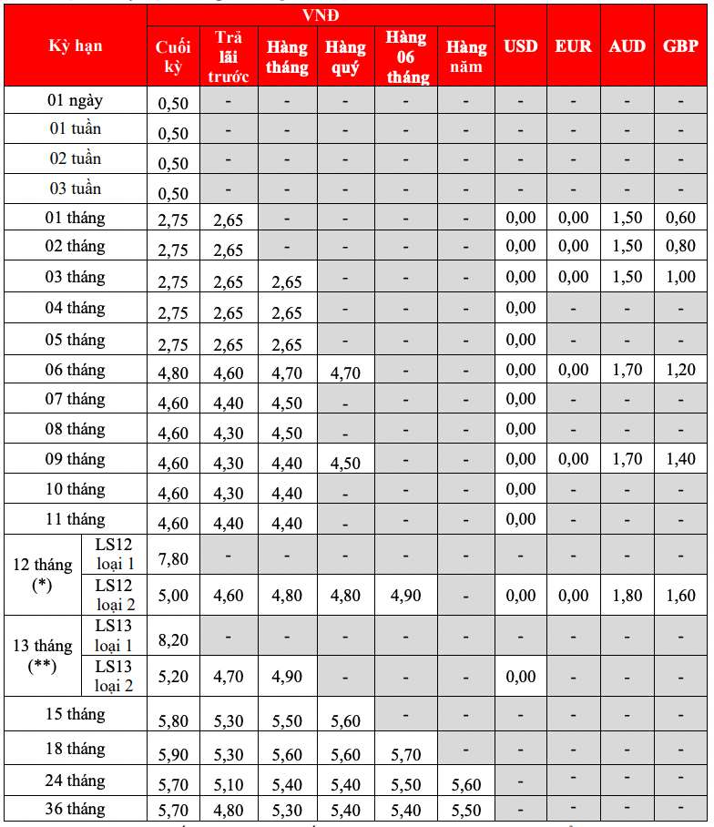 * Thông tin về lãi suất chỉ mang tính chất tham khảo và có thể thay đổi trong từng thời kì. Vui lòng liên hệ điểm giao dịch ngân hàng gần nhất hoặc hotline để được tư vấn cụ thể.