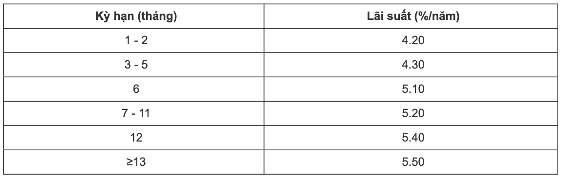 Biểu lãi suất tiết kiệm Baovietbank. Ảnh chụp màn hìnhNCB niêm yết lãi suất cao nhất kỳ hạn 12 tháng ở mức 5,5%/năm khi khách hàng gửi tiết kiệm An Phú. Khách hàng gửi tiền truyền thống chỉ nhận lãi suất 5,35%/năm.