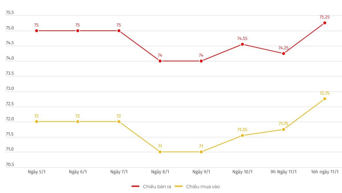 Giá vàng trong nước điều chỉnh tăng mạnh trong phiên chiều nay.Đến 16h ngày 11.1.2024, giá vàng SJC được Tập đoàn DOJI niêm yết chiều mua vào ở ngưỡng 72,75 triệu đồng/lượng; giá bán ra là 75,25 triệu đồng/lượng. Chênh lệch giá mua - bán vàng tại DOJI ở ngưỡng 2,5 triệu đồng/lượng.