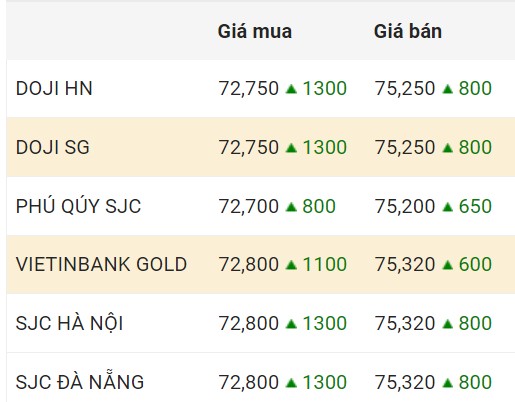 Công ty VBĐQ Sài Gòn SJC niêm yết, giá vàng mua vào 72,8 triệu đồng/lượng; giá bán ra là 75,3 triệu đồng/lượng. Chênh lệch giá mua - bán vàng tại Công ty VBĐQ Sài Gòn SJC ở mức 2,5 triệu đồng/lượng.