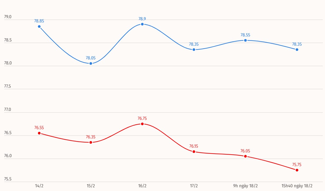 Tính đến 15h40 ngày 18.2, giá vàng trong nước được Tập đoàn DOJI niêm yết chiều mua vào ở ngưỡng 75,75 triệu đồng/lượng; giá bán ra ở mức 78,35 triệu đồng/lượng. Chênh lệch giá mua - bán vàng SJC tại DOJI ở mức 2,6 triệu đồng/lượng.
