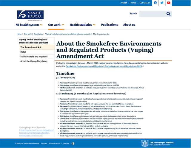 Đến ngày 5.8.2020, chính phủ NZ đã thông qua Luật quản lý các sản phẩm thuốc lá mới giảm tác hại, nhằm thay thế cho thuốc lá điếu thông thường. Đạo luật mới của NZ hướng tới mục tiêu xây dựng môi trường không khói thuốc với các sản phẩm thay thế giảm tác hại, đưa thêm điều khoản mới là "hỗ trợ người hút thuốc chuyển đổi từ thuốc lá điếu sang các sản phẩm thuốc lá mới ít gây hại hơn đáng kể và được kiểm soát theo luật định".