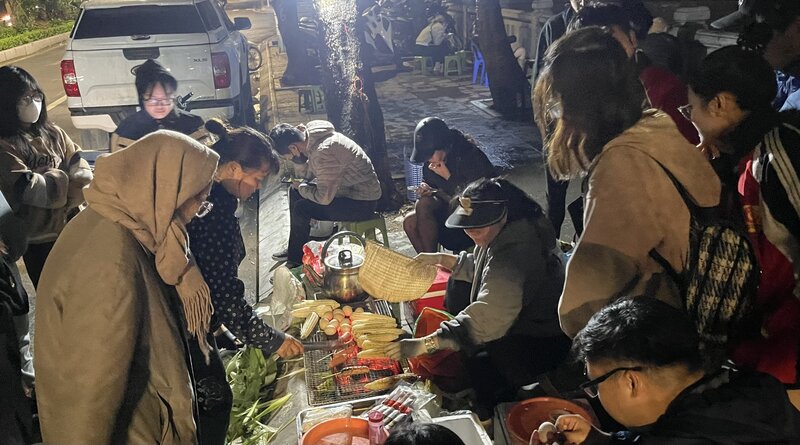 Giới trẻ thích thú trải nghiệm ăn ngô, khoai nướng Hồ Tây. Ảnh: Hải Đăng Nguồn: https://laodong.vn/thi-truong/ngo-khoai-nuong-vao-mua-tieu-thuong-thu-gan-nua-chi-vang-moi-toi-1274746.ldo