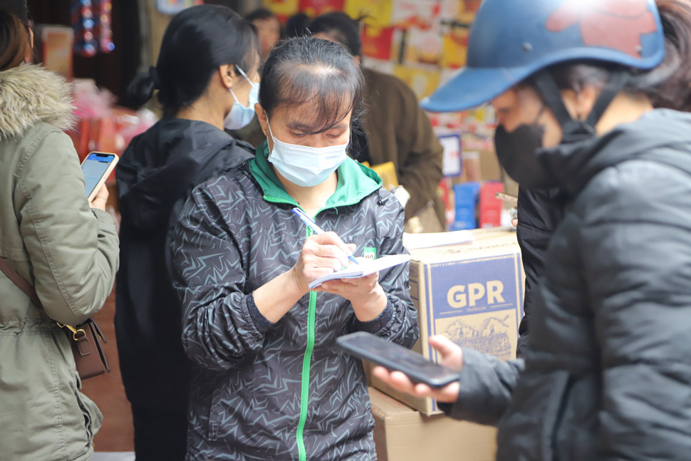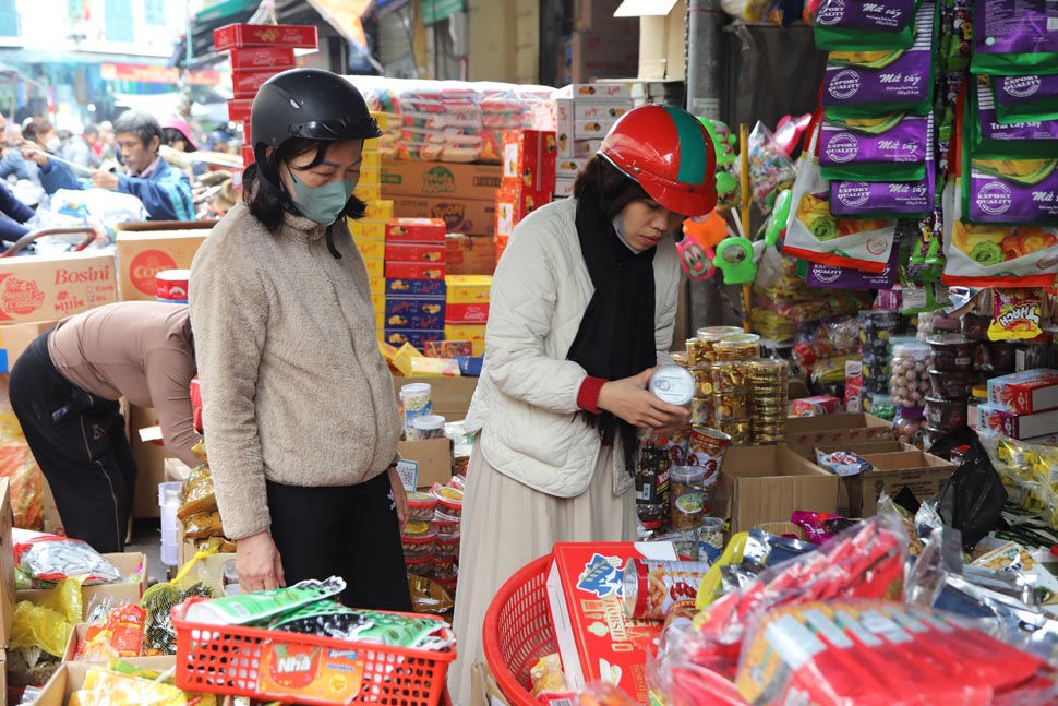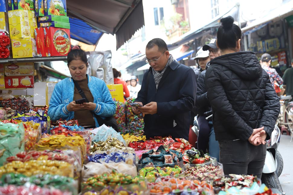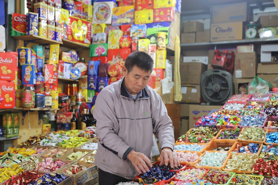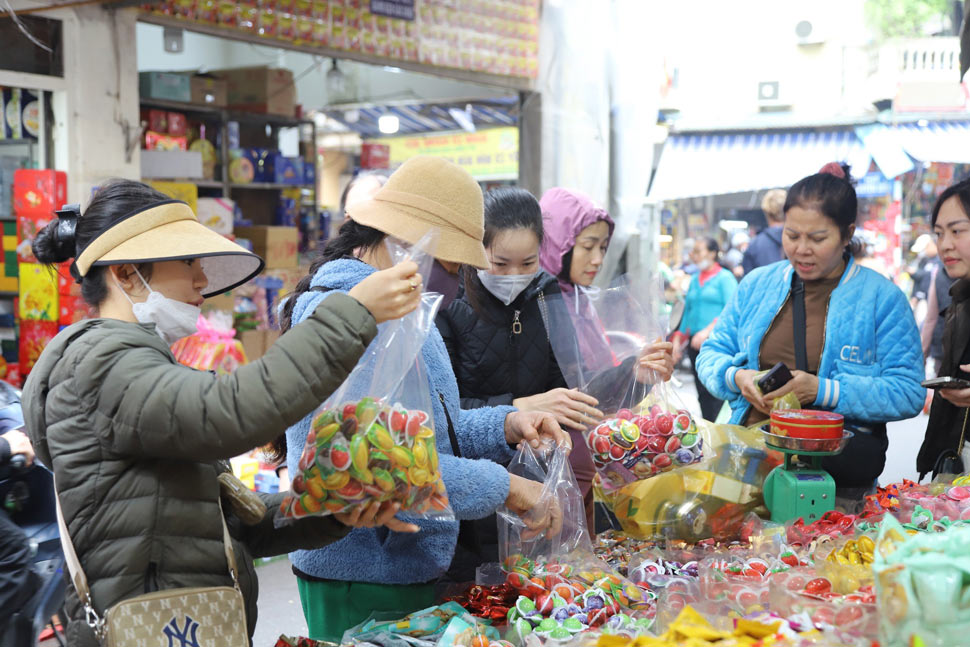 Những ngày cận Tết, người dân đổ về phố hàng Giầy mua bánh kẹo Tết không ngớt, người bán không ngơi tay. Nhiều chủ cửa hàng phải thuê thêm nhân viên để phục vụ nhu cầu sắm Tết của người dân.