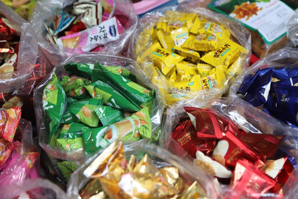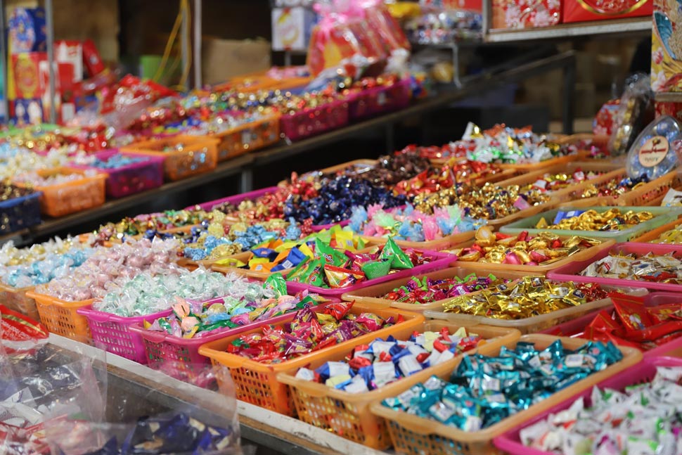 Theo nhiều chủ cửa hàng, bánh kẹo tại đây rất đa dạng, có đủ loại gồm cả hàng nhập từ Pháp, Hàn Quốc, Trung Quốc... và hàng nội địa.