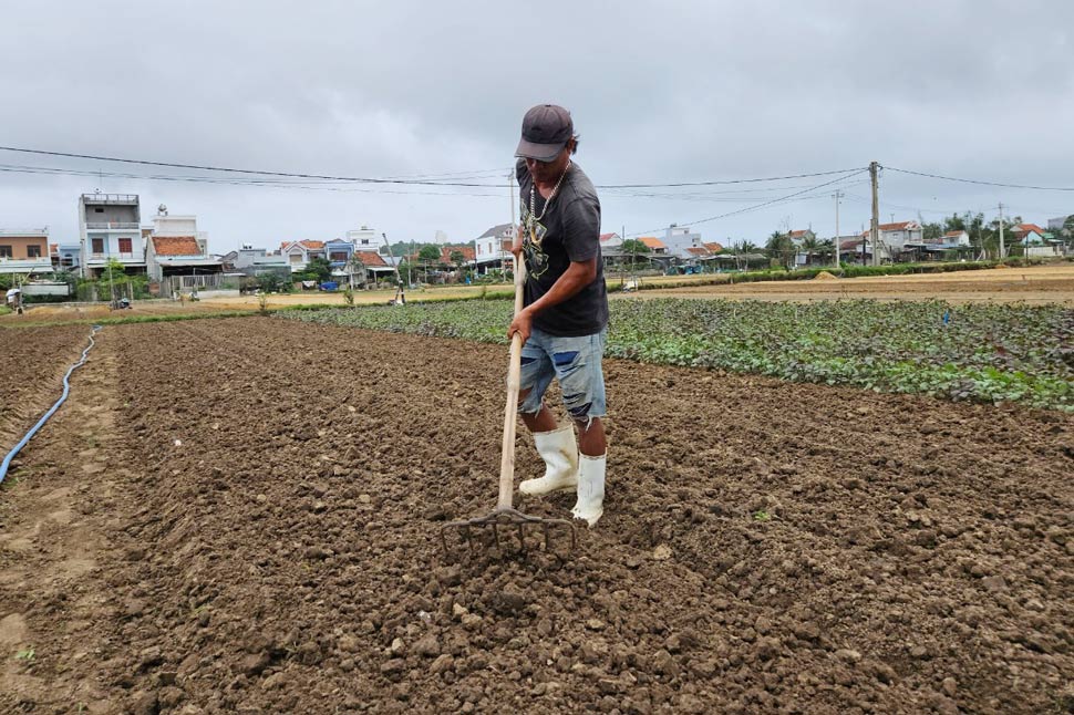Ông Thiên làm đất để xuống giống hoa lay ơn để kịp bán Tết. Ảnh: Hoài LuânKhông khác gì bà Nga, ông Nguyễn Văn Thiên (42 tuổi, xã Bình Ngọc) cho hay, vụ hoa năm nay, gia đình ông chỉ trồng khoảng 50kg giống hoa lay ơn bông vàng, giảm một nửa so với những năm trước.