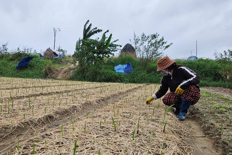 Bà Nga thăm các luống hoa lay ơn. Ảnh: Hoài LuânKhác với mọi năm, gia đình bà Nguyễn Thị Nga (40 tuổi, trú xã Bình Ngọc, TP Tuy Hòa) năm nay chỉ trồng khoảng 20kg giống hoa lay ơn trên 100m2 đất, vì lo lắng thời tiết cuối năm sẽ có mưa nhiều.
