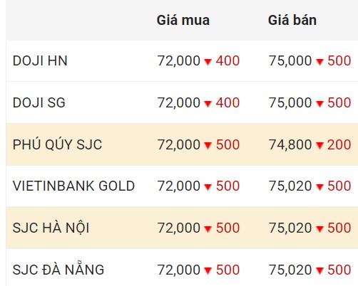Trong khi đó, Công ty VBĐQ Sài Gòn SJC niêm yết, giá vàng mua vào 72 triệu đồng/lượng; giá bán ra là 75 triệu đồng/lượng. Chênh lệch giá mua - bán vàng tại Công ty VBĐQ Sài Gòn SJC là 3 triệu đồng/lượng.