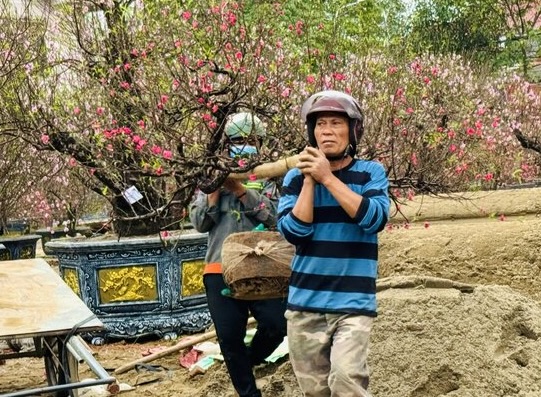 Các tiểu thương liên tục vận chuyển những gốc đào tươi sắc để chờ khách. Ảnh: Quỳnh TrangKhông chỉ giảm số lượng đào, vườn của bà Hà còn hạn chế tối đa thuê lao động chăm sóc thời vụ. Mỗi ngày, các thành viên trong gia đình phải làm cật lực từ sáng tới đêm để tiết kiệm chi phí. Dù vậy, bà Hà vẫn cảm thấy khá lo lắng vì khả năng hoa "ế" là rất cao.