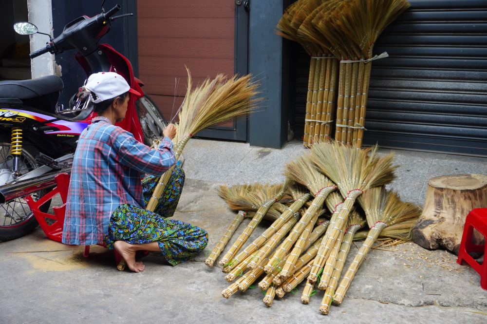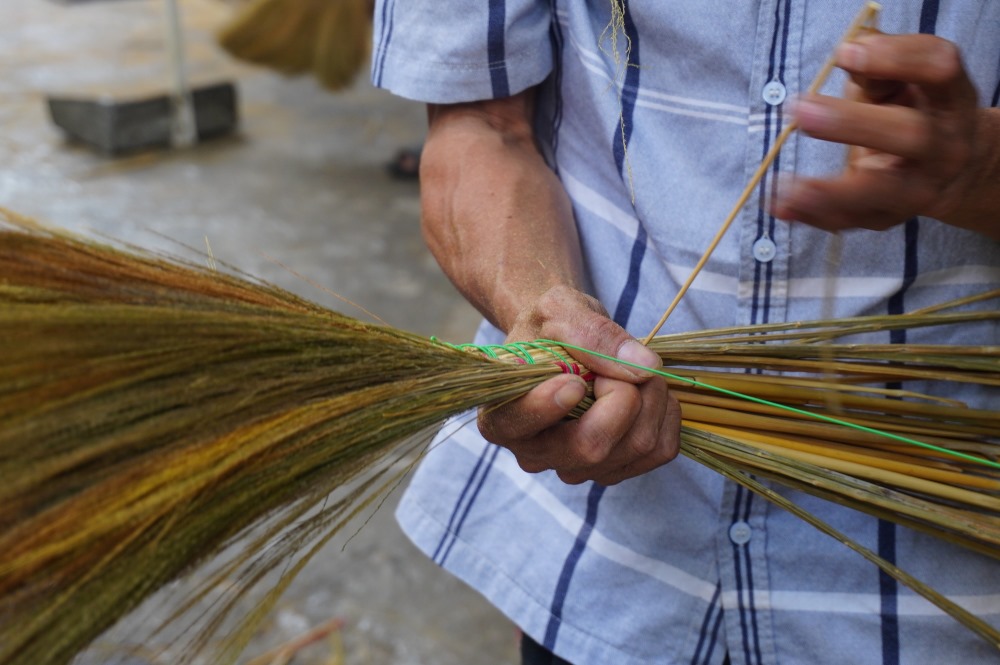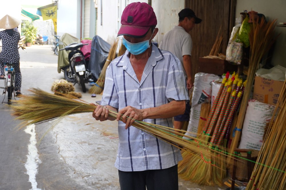 Công đoạn khó hơn và đòi hỏi nhiều sức hơn sẽ được các thợ nam thực hiện vì phải đảm bảo các bó chổi được kết lại với nhau thật chắc chắn. Ông Trương Văn Hải (55 tuổi, thợ làm chổi) cho biết, ông đã làm công việc này đến nay đã được hơn 30 năm, dù nghề đang dần mai một nhưng vì đây là công việc từng giúp ông nuôi được cả gia đình nên ông vẫn gắn bó đến tận bây giờ.