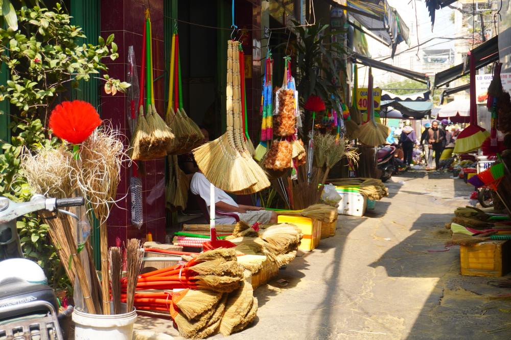Theo chỉ dẫn của những người dân trên đường Phạm Phú Thứ, không khó để chúng tôi tìm ra khu xóm nhỏ - nơi an cư của nhiều hộ gia đình vẫn còn gắn bó với nghề làm chổi. Trước hiên nhà của mỗi gia đình là hình ảnh bận rộn, luôn tay của những người thợ làm chổi. Theo quan sát, có khoảng chục hộ với nhiều nhân công đang tất bật các công đoạn để ra chiếc chổi hoàn thiện vào những ngày giáp Tết.