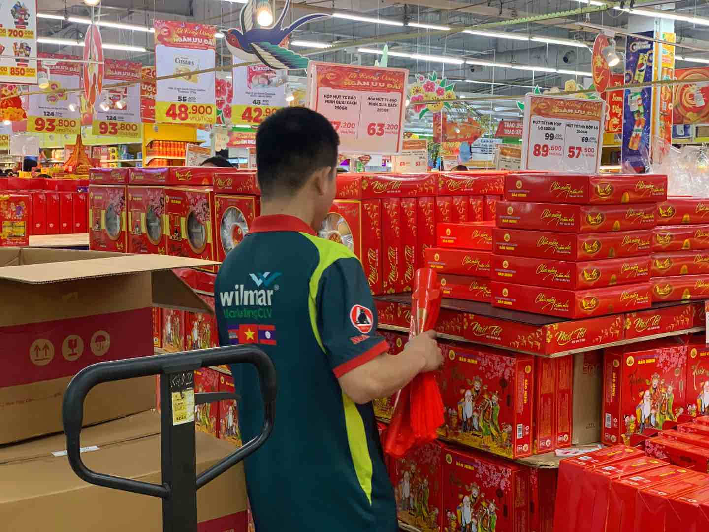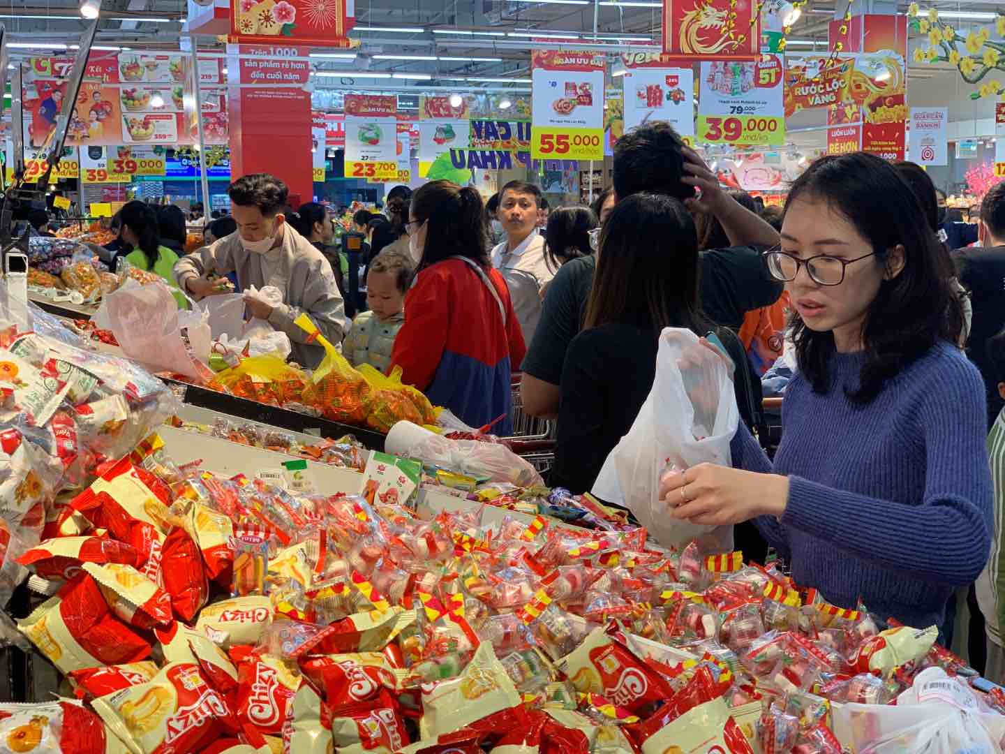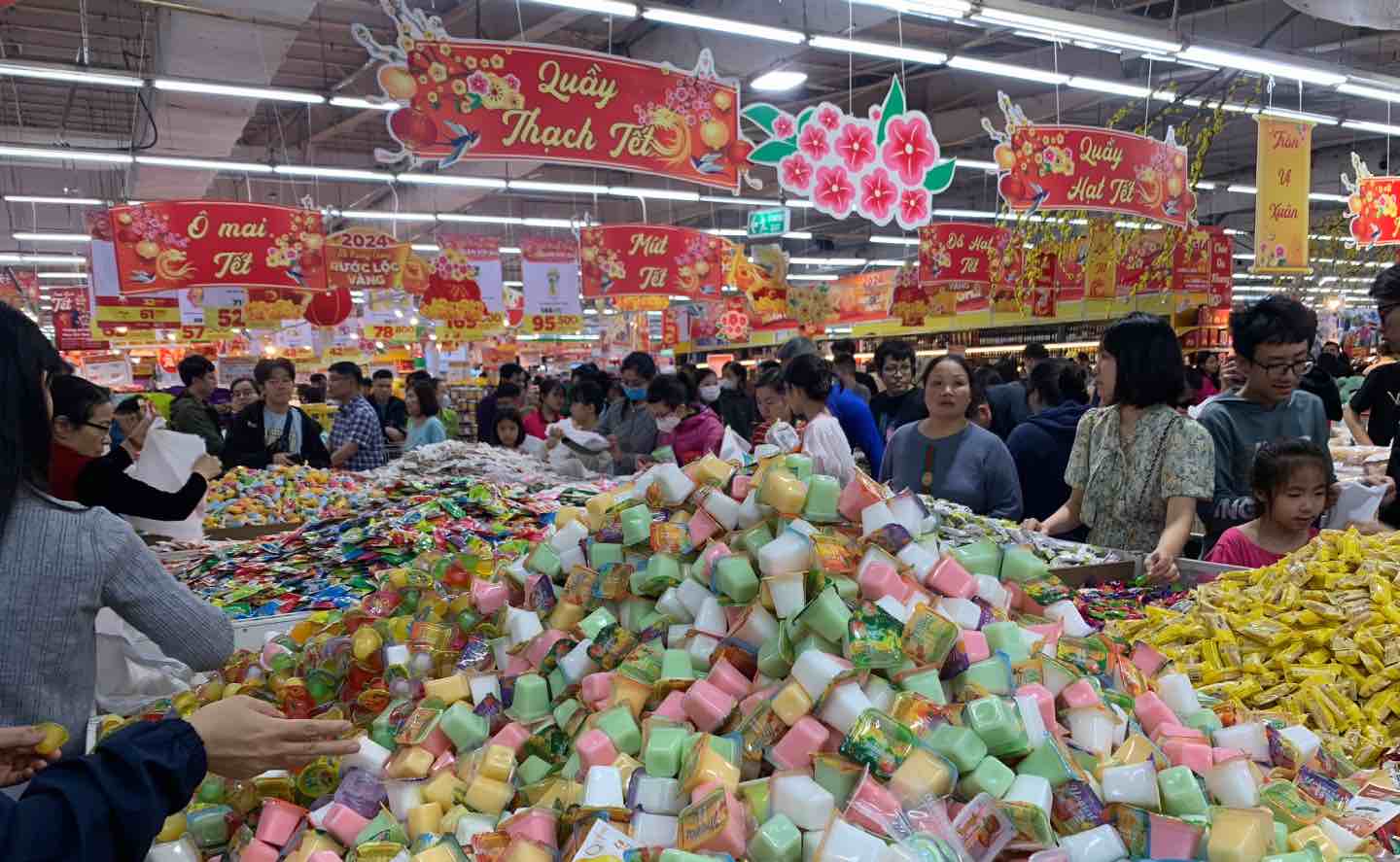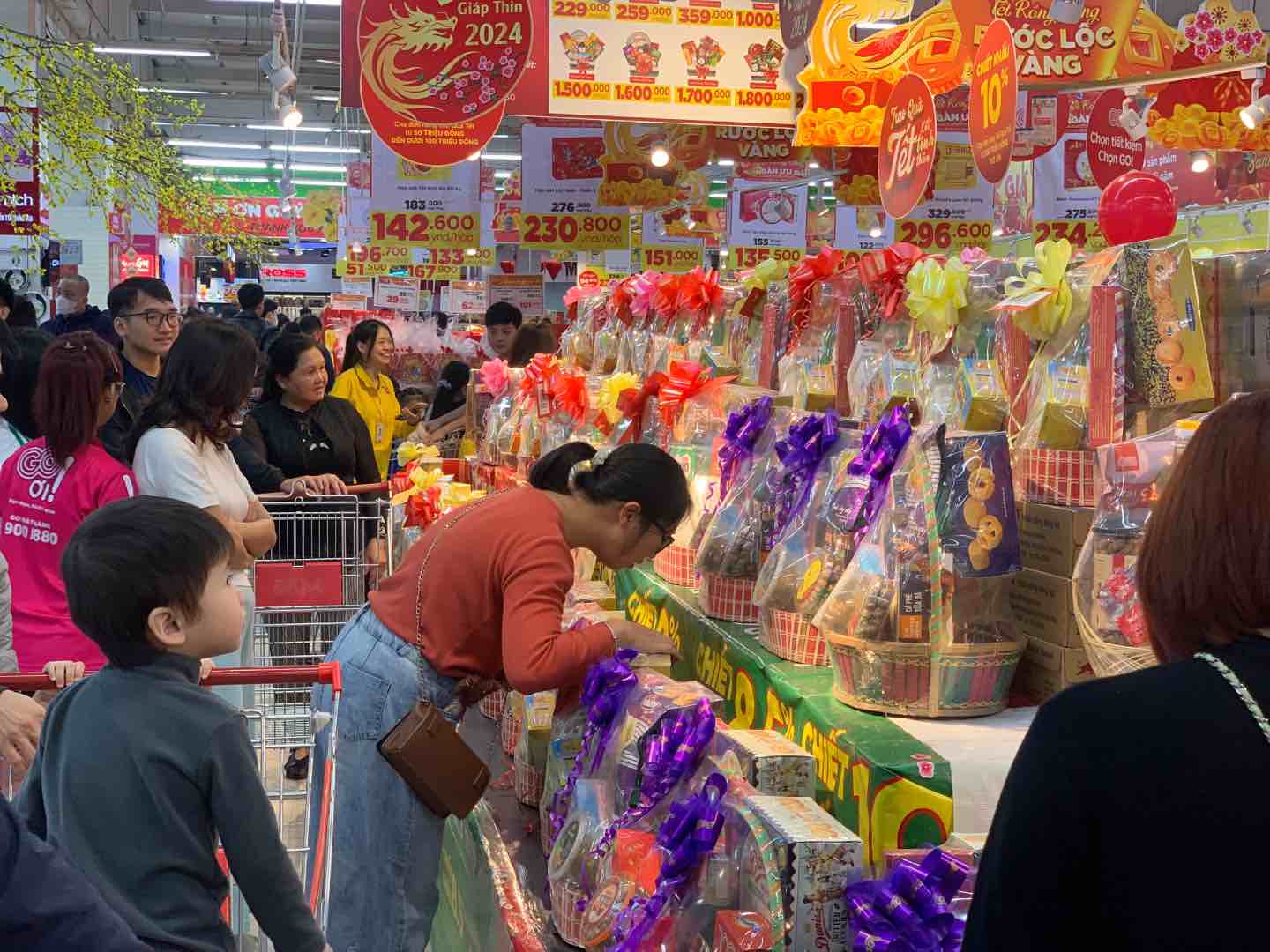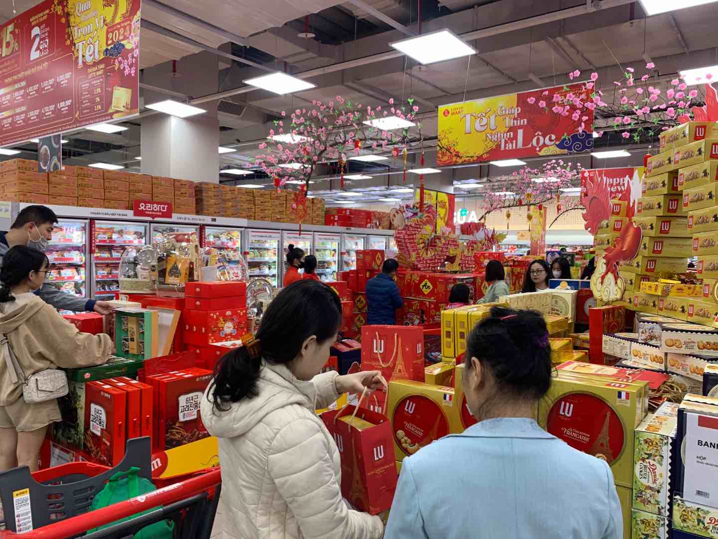 Tại siêu thị Big C Thăng Long (Cầu Giấy, Hà Nội), những thực phẩm thu hút người dân dịp Tết như bánh kẹo, các loại mứt, các loại hạt,... đều được đặt tại những vị trí riêng để thuận lợi cho việc lựa chọn, thanh toán.