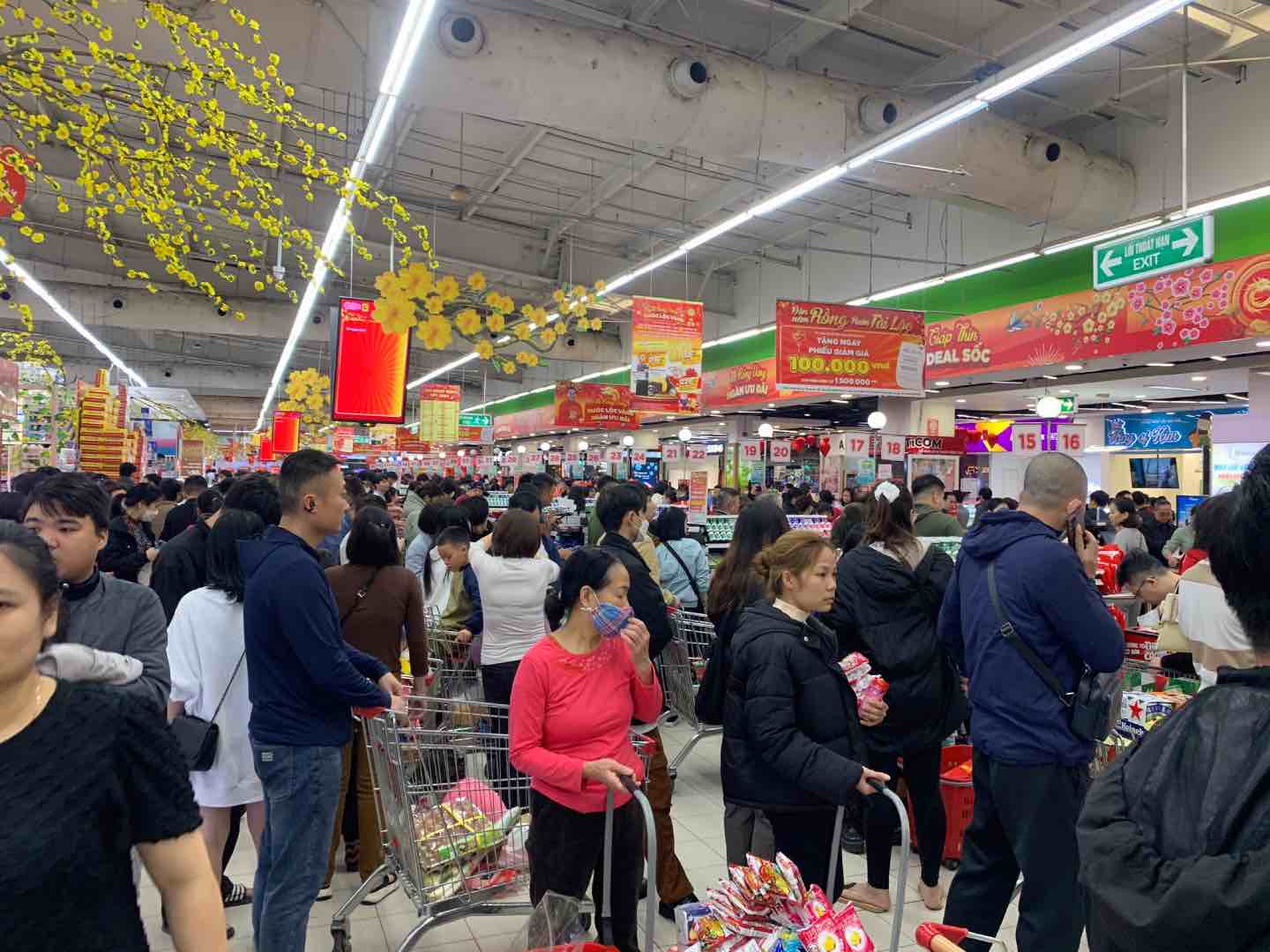 Với nhiều chương trình ưu đãi, các siêu thị đã thu hút được đông đảo người dân tới mua sắm Tết. Ảnh: Nhật Minh Nguồn: https://laodong.vn/kinh-doanh/nua-tieng-xep-hang-van-chua-thanh-toan-xong-o-sieu-thi-ha-noi-ngay-can-tet-1300979.ldo